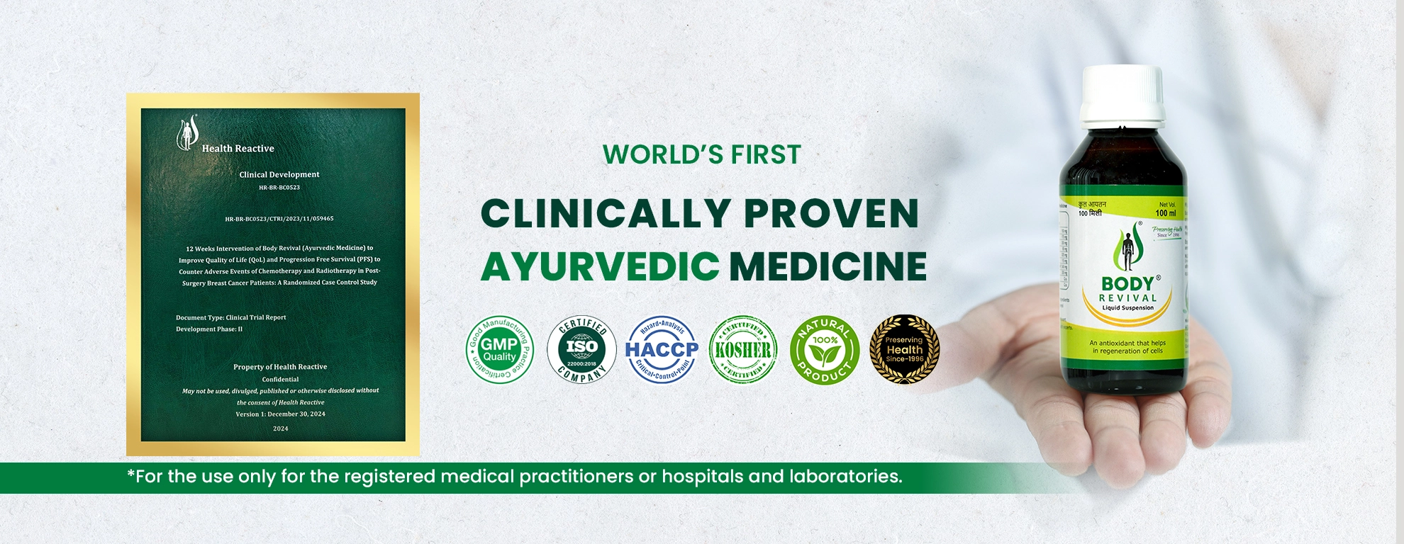 Get relief from Complications of Various Cancer Diseases like Mouth cancer, Prostate cancer, Stomach Cancer, Tongue cancer, Breast cancer, Gallbladder cancer, Liver cancer, Ovarian Cancer, Throat Cancer, Tonsil cancer, Kidney cancer, Lungs cancer, Pancreas cancer, uterus cancer, Cervical cancer, Lymphoma cancer, Sarcoma and Multiple Myeloma with Ayurveda. Body Revival is a Ayurvedic Liquid suspension with composition of Nature's Best 9 Ancient Herbs which works on Immunotherapy, Principle of Cell Theory & Cell Regeneration.